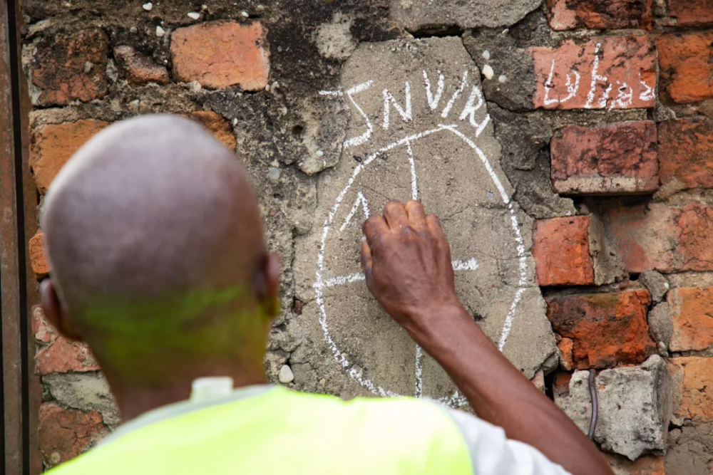 In the days leading up to the August 2025 campaign, Marguerite is not working alone. At her side is Antoine Otende Urudi, wielding a piece of chalk. Together, they go door to door: Marguerite speaks with families while Antoine marks each doorway with a sign showing how many children under five live inside and need to be vaccinated.