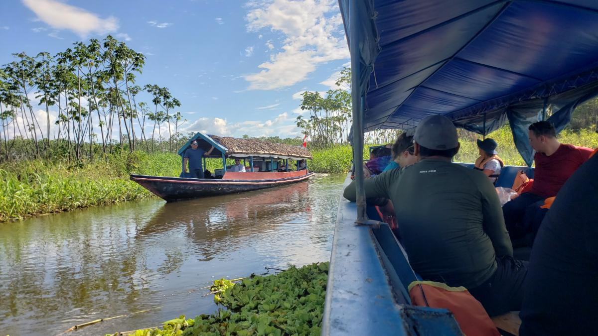 Once the funding goal was reached, in early April I was able to move forward with procuring materials moving everything by truck, including three large 2500-liter water tanks, 100 bags of concrete, rebar, tools etc., from the city of Iquitos to the port town of Nauta. After a couple of hours delay fixing a flat tire, we arrived at Nauta where everything was then loaded onto boats for the journey downriver where we reached a very narrow inlet into a small stream that would eventually lead our large boats to the village of Betsaida. This part of the trip was fantastic going through the flooded jungles over water plants, spotting all kinds of birds, sloths, and other fauna and flora.