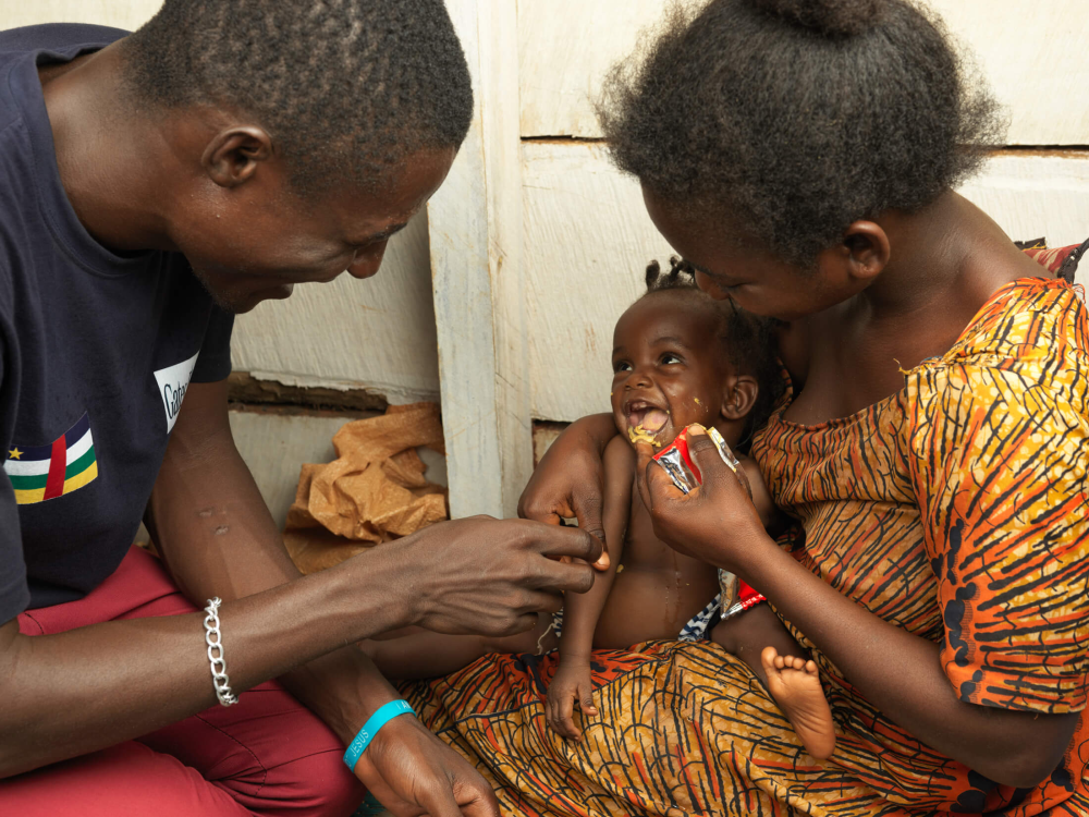 CHW Gael Endjitamatohi and Enriette Yitinzapa feed therapeutic food to Enriette’s daughter at PK3 camp.