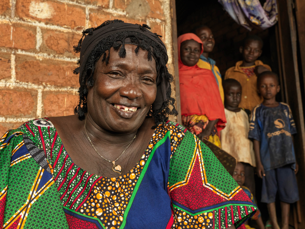 Agnesse Longo at home with her grandchildren. With the money she saved from her participation with the VSLA, Agnesse purchased a home for her daughter’s family.