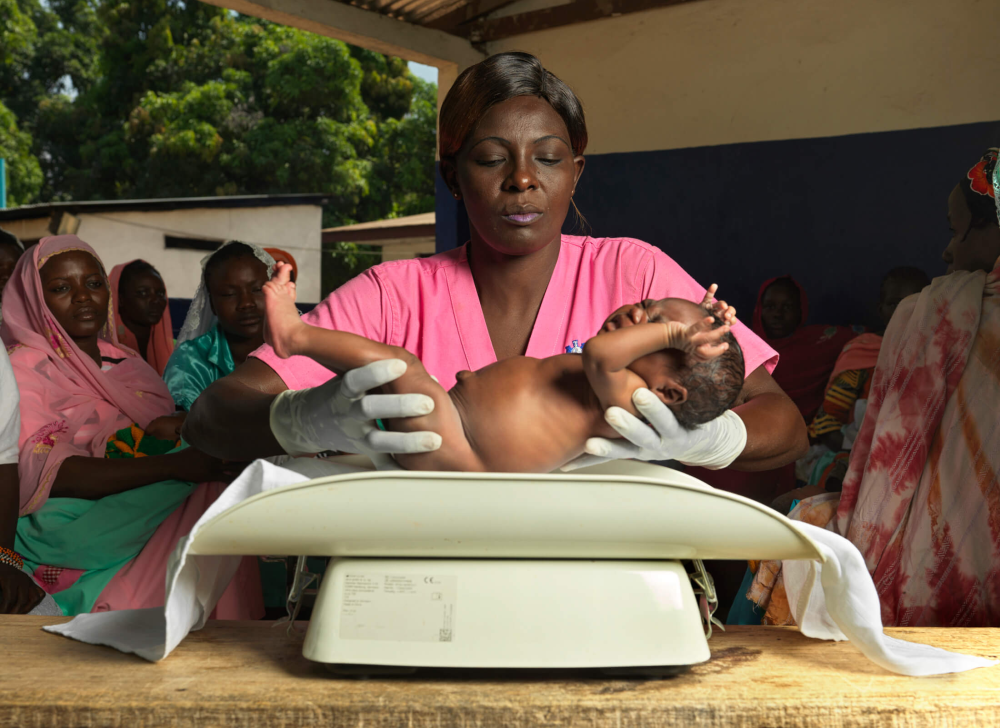 Pelagie weighs a newborn child in the postnatal clinic at Birao District Hospital.