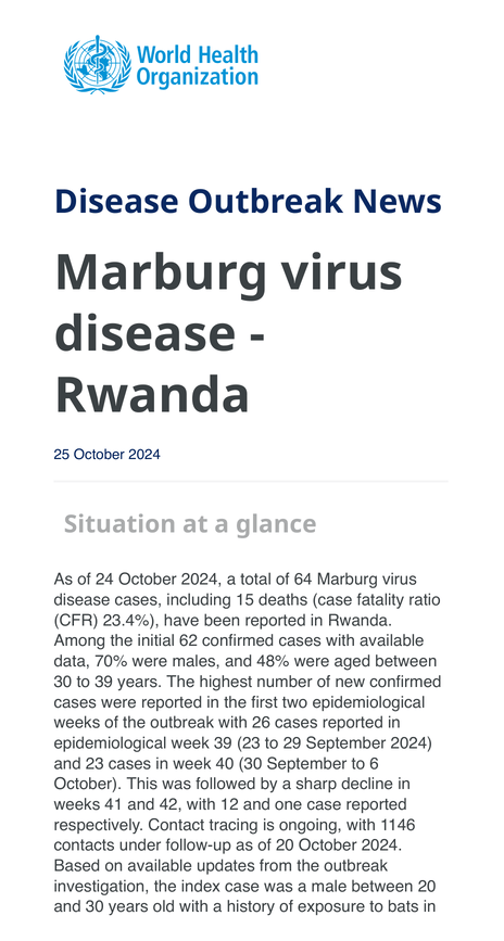 Rwanda’s outbreak ended in December 2024 with a historic 23% fatality rate, the lowest ever recorded for Marburg. Of 66 patients, 15 died; more than three-quarters were healthcare workers. After six weeks apart, Firew’s family finally reunited at the Kigali airport.